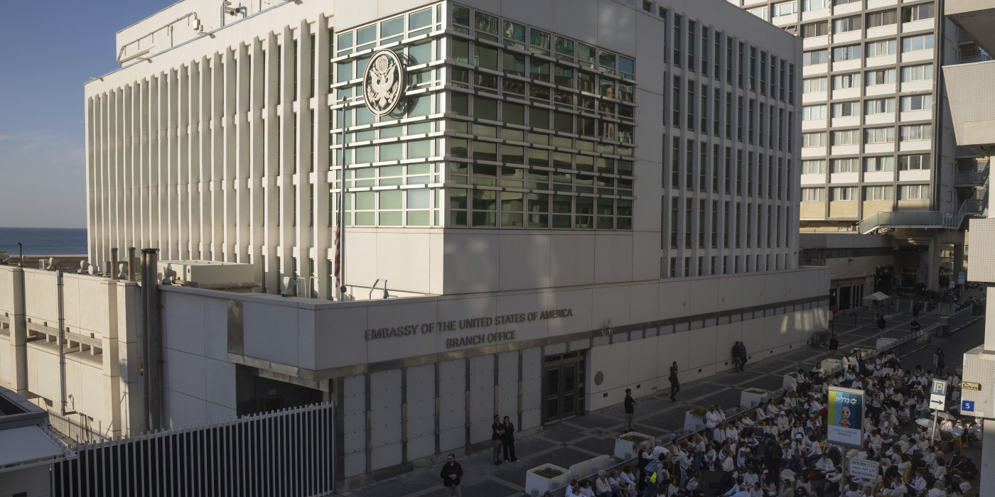 Activists sit in front of the U.S. Embassy branch office in Tel Aviv, Israel, during a protest on Jan. 8, 2025. Ohad Zwigenberg/AP hide caption toggle caption Ohad Zwigenberg/AP...