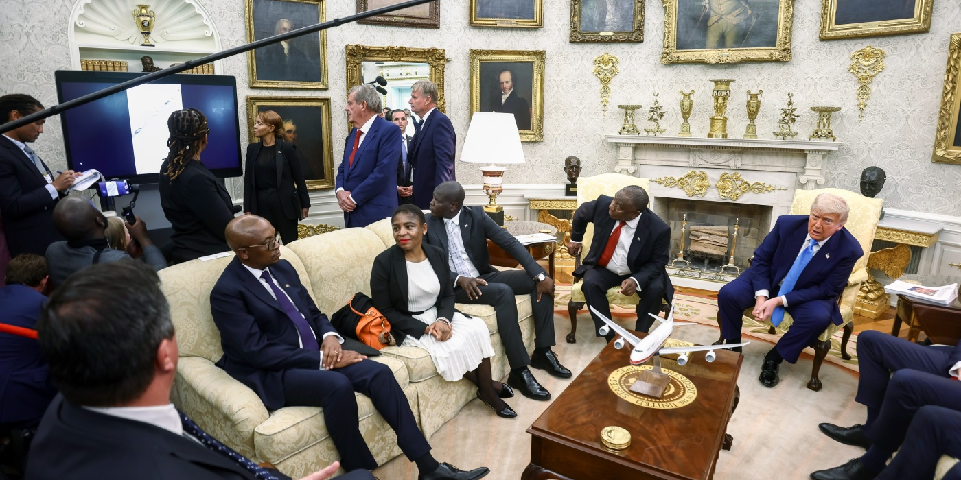 US President Donald Trump, right, and Cyril Ramaphosa, South Africa's president, second right, as a video plays during a meeting in the Oval Office of the White House in...
