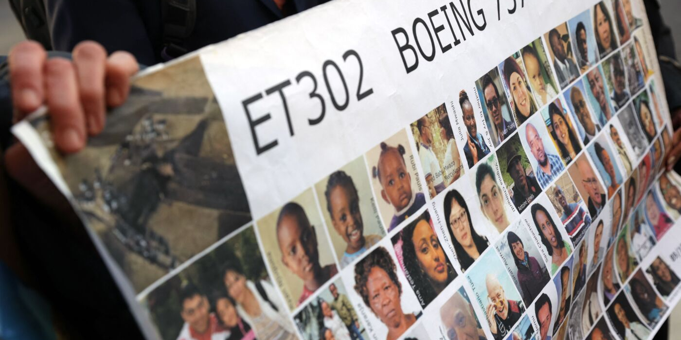 Relatives of victims hold a placard with photos of victims of the Ethiopian Airlines Flight 302 crash in March 2019, prior to a hearing in Fort Worth, Texas, in...