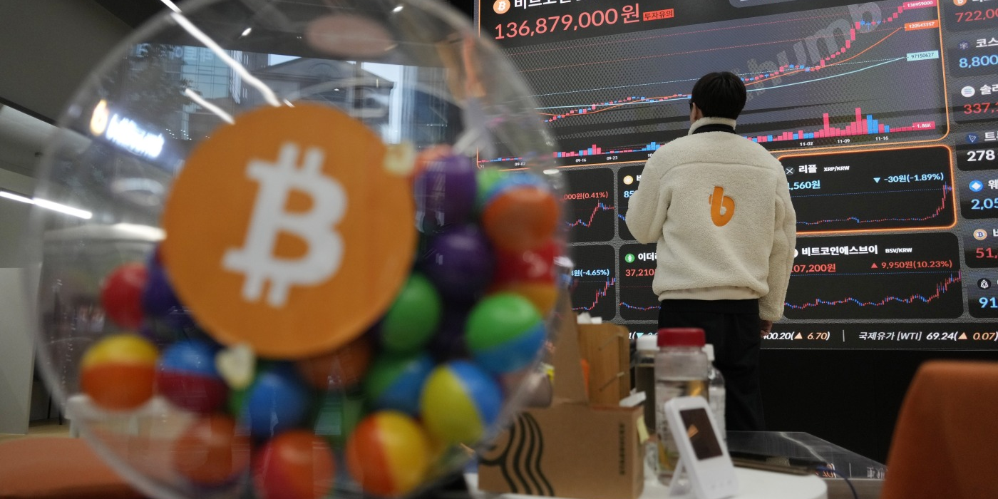 FILE - An employee watches an electronic signboard displaying the prices of Bitcoin and other cryptocurrencies at the lounge of Bithumb cryptocurrency exchange in Seoul, South Korea, Nov. 21,...
