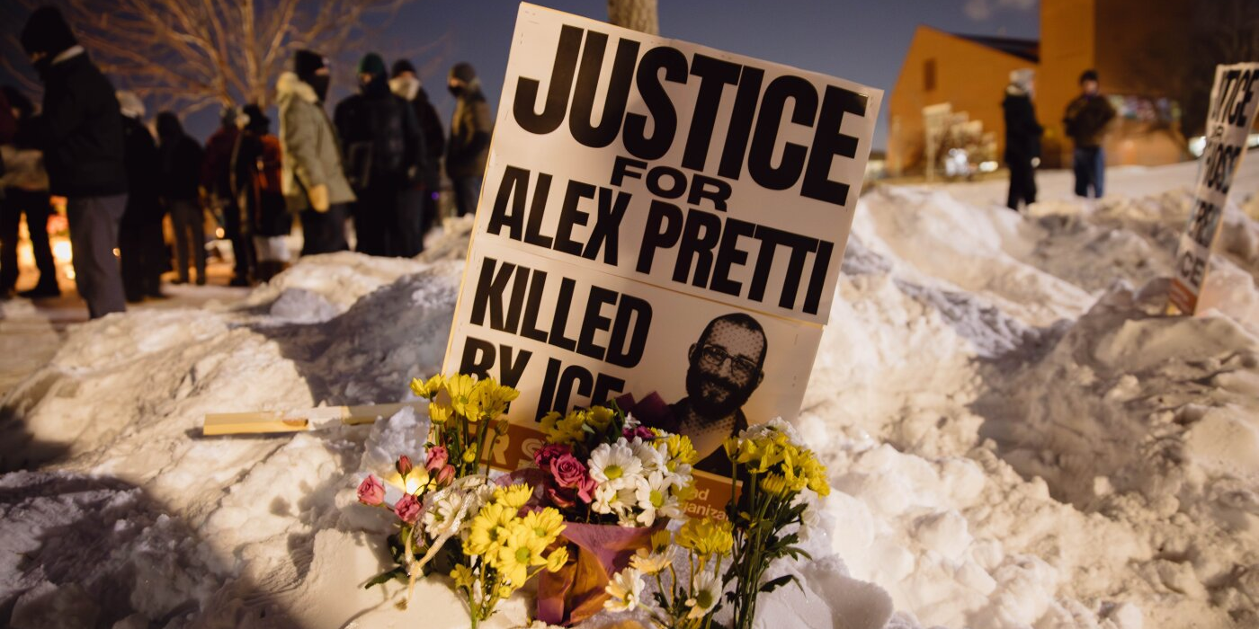 A sign for Alex Pretti, who was killed earlier in the day by a U.S. Border Patrol officer, is displayed during a vigil Saturday in Minneapolis. Zaydee Sanchez for...
