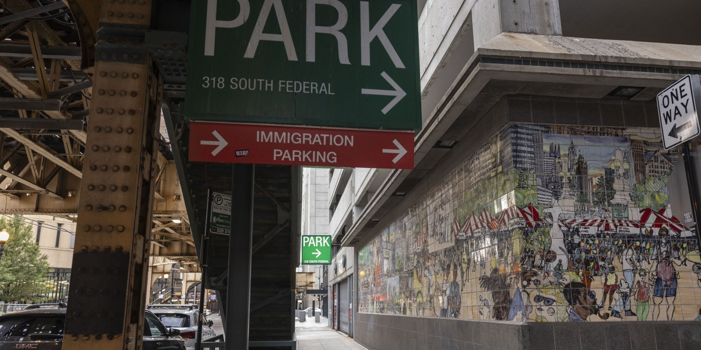Signs direct traffic to the immigration court parking lot in Chicago, Ill., in August 2024. Christian Monterrosa/AFP via Getty Images hide caption toggle caption Christian Monterrosa/AFP via Getty Images...