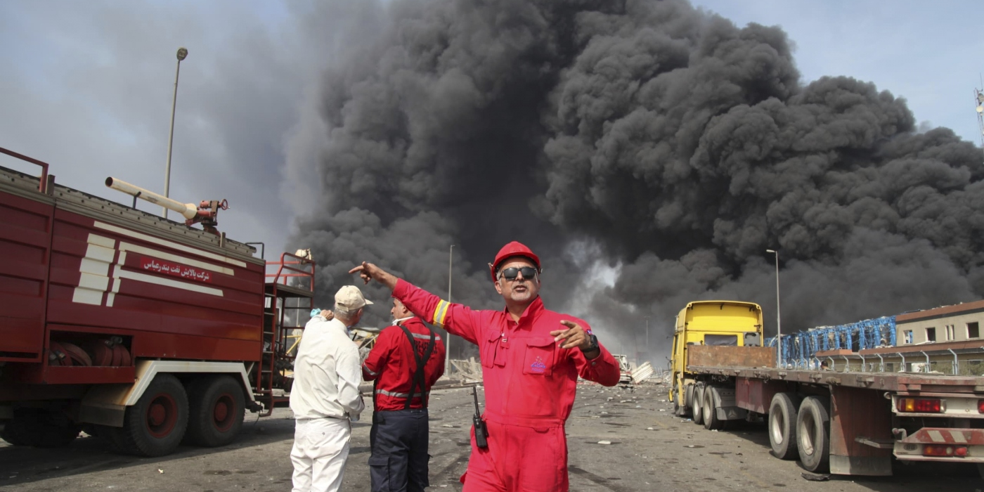 In this photo provided by Islamic Republic News Agency (IRNA), firefighters work as black smoke rises in the sky after a massive explosion rocked a port near the southern...