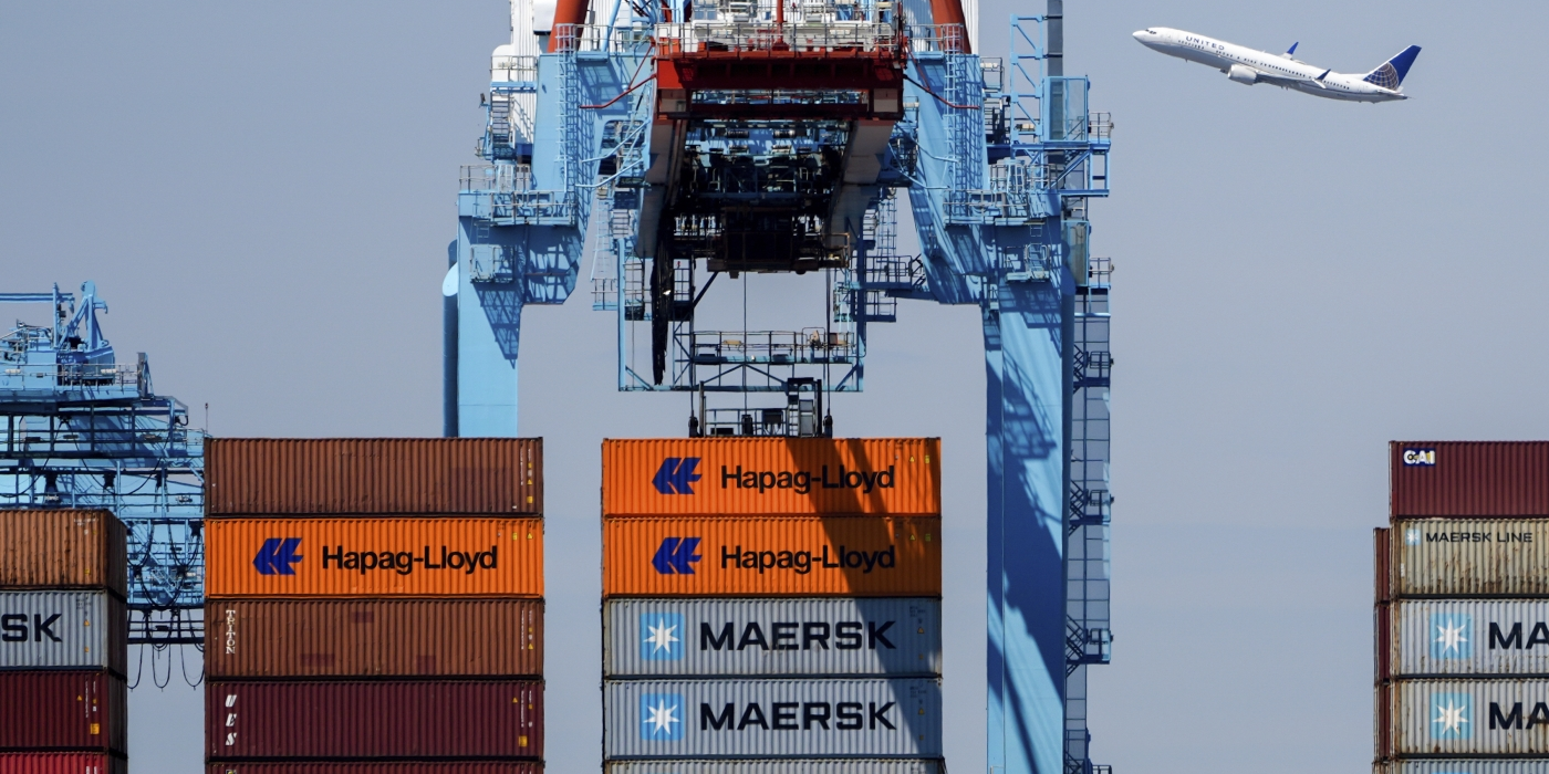 An airplane flies over the container ship Alexandra at the Port Newark Container Terminal on April 18 in Newark, N.J. Julia Demaree Nikhinson/AP hide caption toggle caption Julia Demaree...