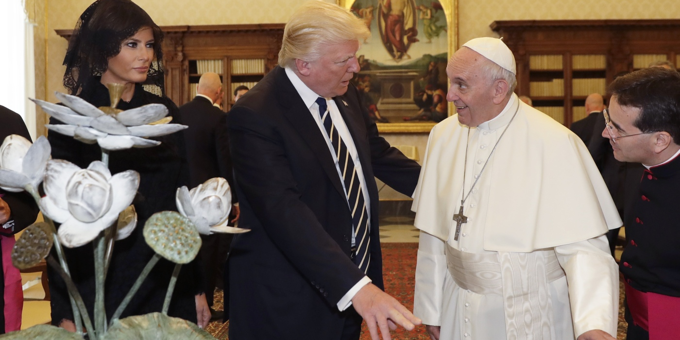 Pope Francis exchanges gifts with US President Donald Trump (C) and US First Lady Melania Trump during a private audience at the Vatican on May 24, 2017. US President...