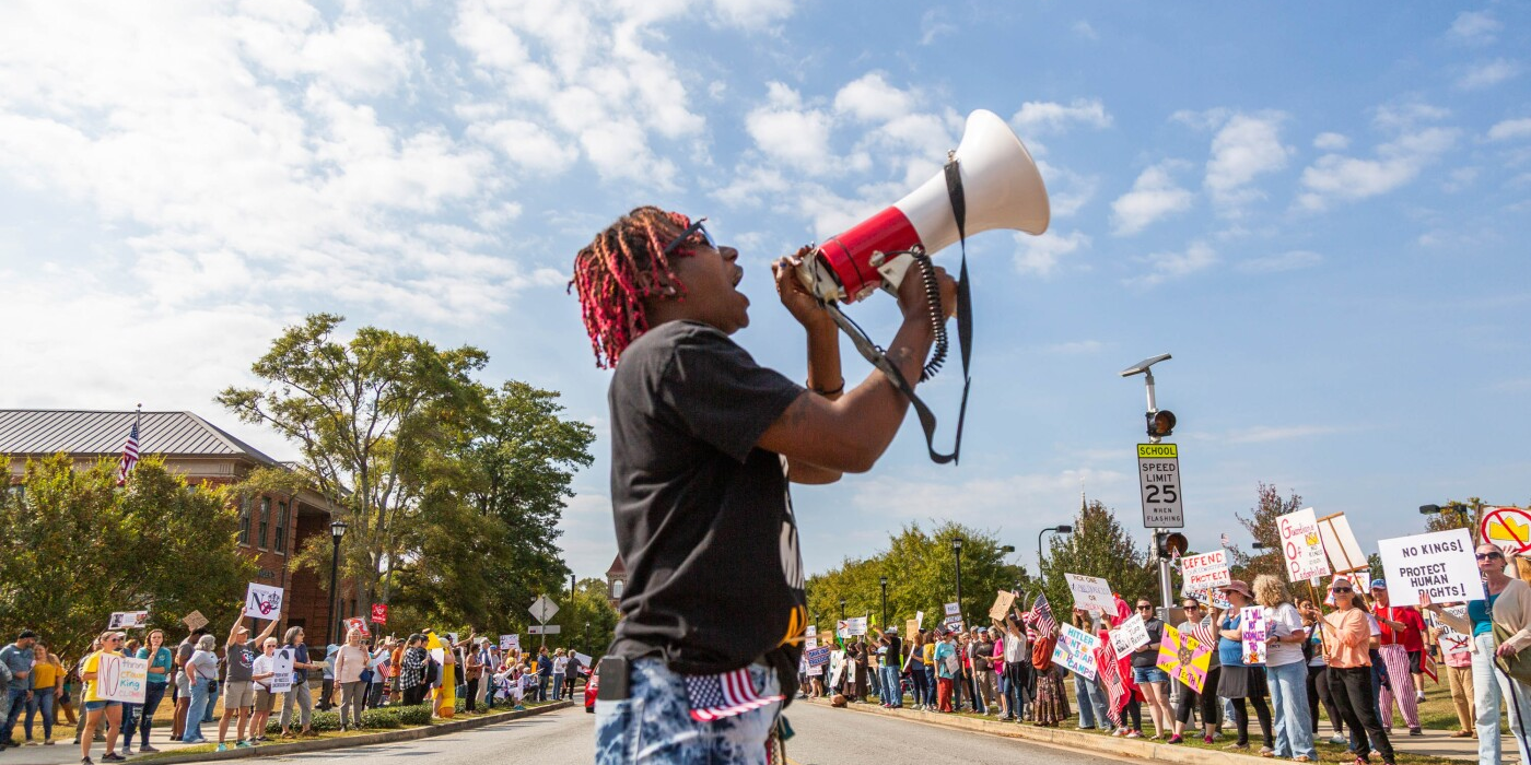 Legacee Medina of Macon, Ga. leads chanting at a No Kings rally between an elementary school and pickleball courts in Macon on October 18, 2025. The rally moved from...