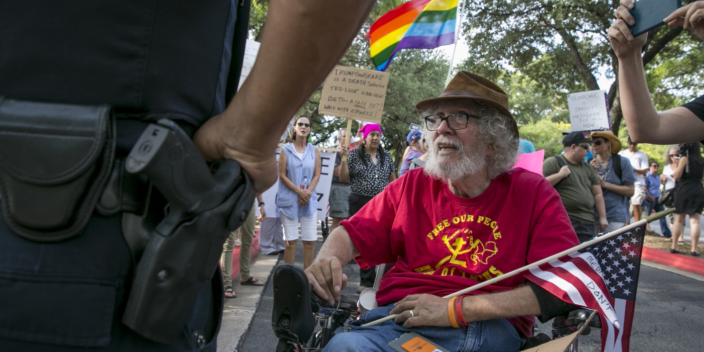 Bob Kafka, a disabled Vietnam veteran, talks with an Austin Police Officer as he and others try to enter a hotel property. Ilana Panich-Linsman/Getty Images hide caption toggle caption...