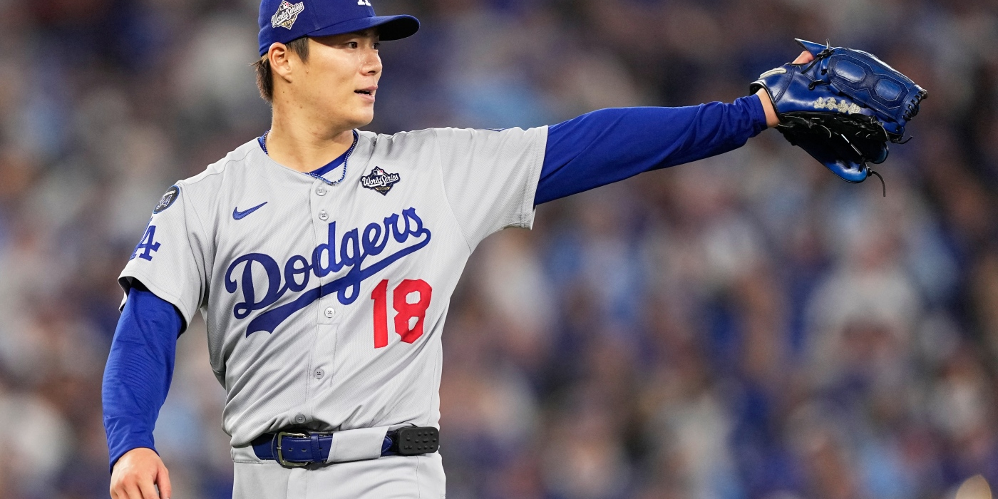 Los Angeles Dodgers pitcher Yoshinobu Yamamoto gestures during the fourth inning in Game 6 of baseball's World Series against the Toronto Blue Jays, on Friday in Toronto. Brynn Anderson/AP...