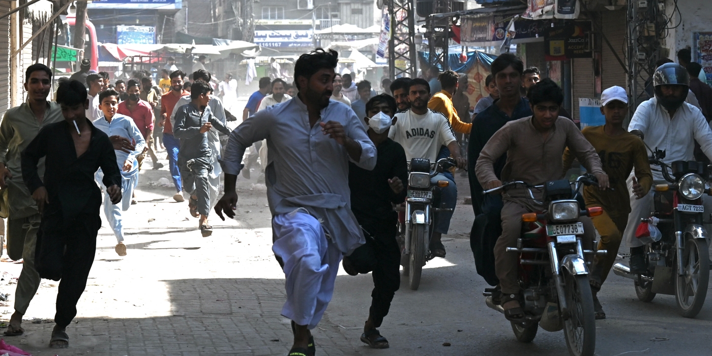 Tehreek-e-Labbaik Pakistan party activists run from police during a protest in support of Palestinians, in Muridke, Pakistan, on Oct. 13. Arif Ali/AFP via Getty Images hide caption toggle caption...
