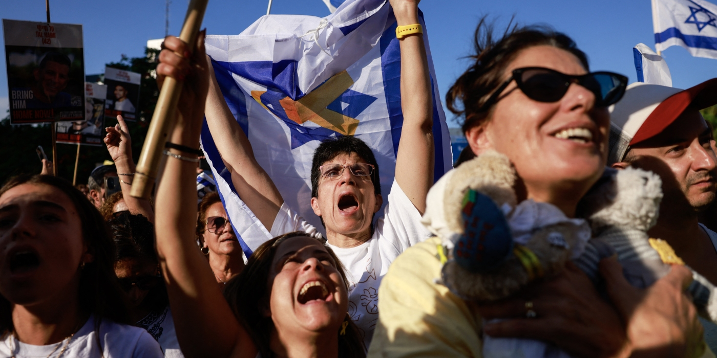 Israelis react as they wait for the release of Israelis still held in Gaza at Hostages Square in Tel Aviv early on Oct. 13, 2025. Menahem Kahana/AFP via Getty...