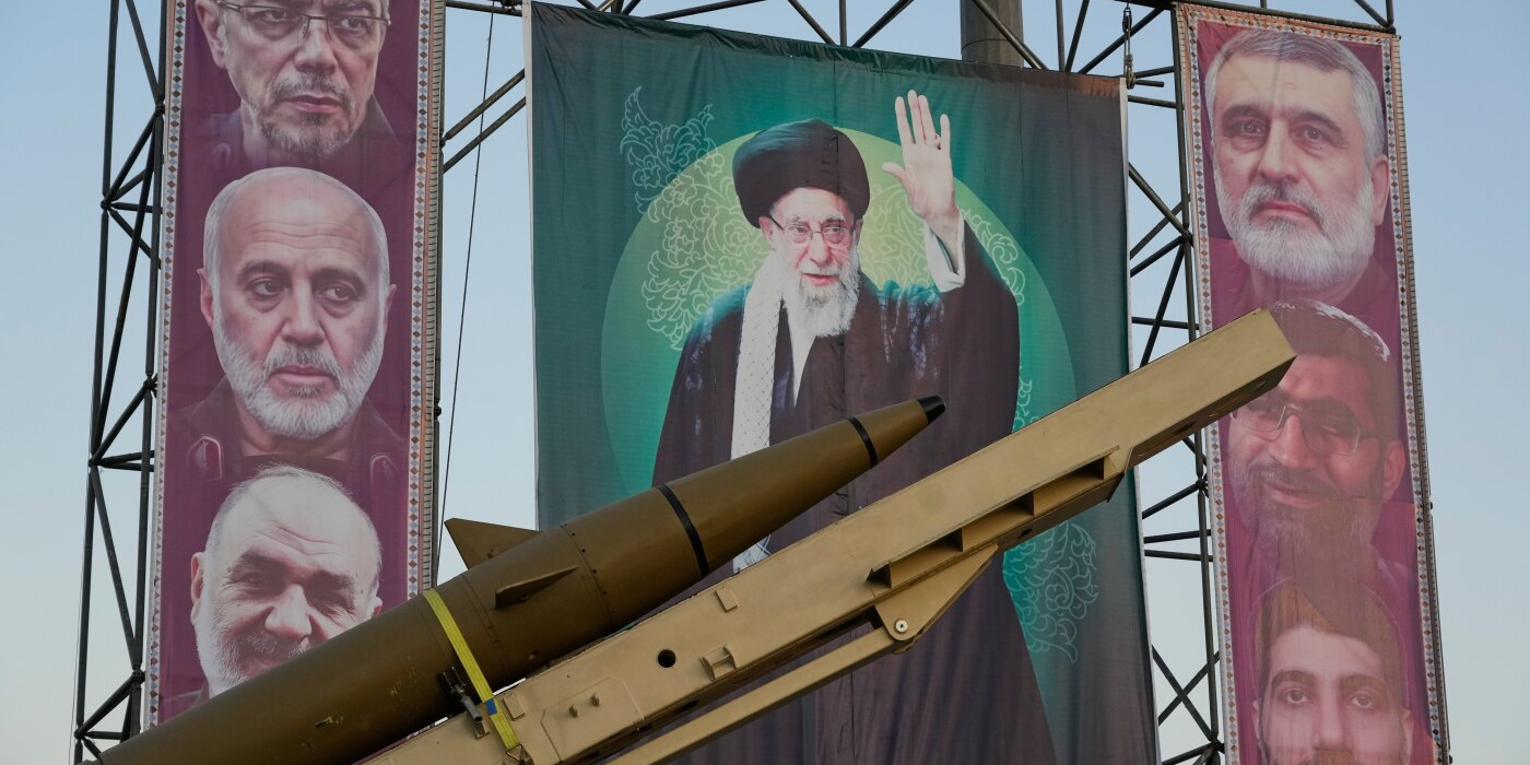 A domestically-built missile and banners showing portraits of the Iranian Supreme Leader Ayatollah Ali Khamenei, center, and armed forces commanders who were killed in an Israeli strike in June,...