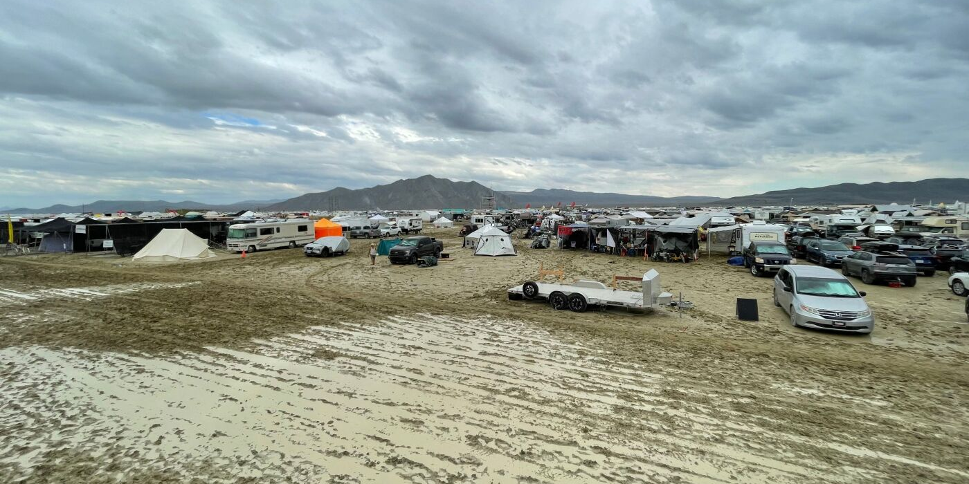 Camps are set on a muddy desert plain on September 2, 2023, after heavy rains turned the annual Burning Man festival site in Nevada's Black Rock desert into a...