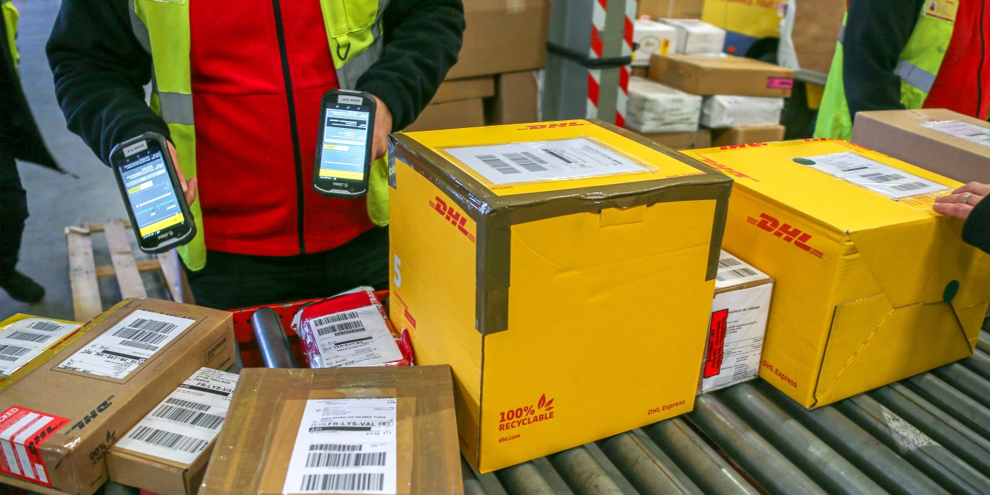 A warehouse worker uses a scanner to identify cartons of parcels of goods on a conveyor belt in a hangar at DHL's parcel distribution and express freight warehouse in...