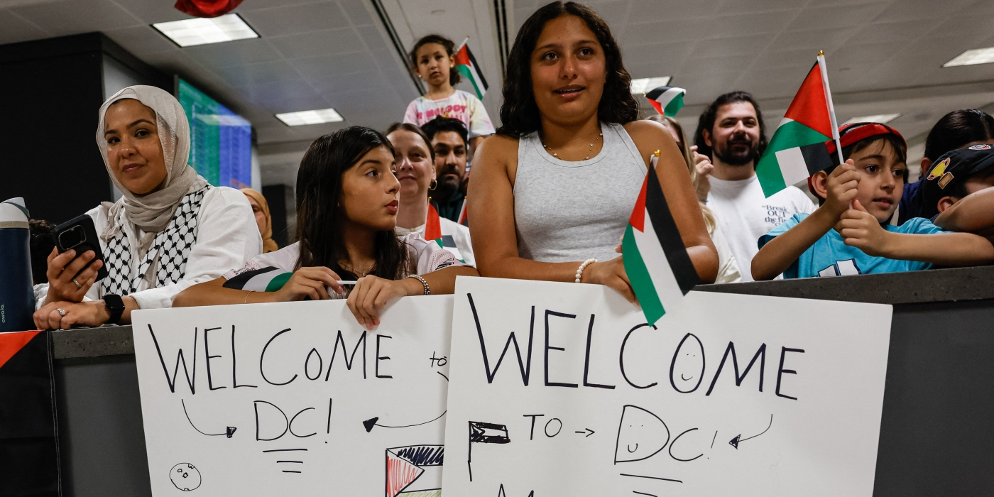 A group of people gather to greet two severely wounded Palestinian teenagers from Gaza arriving at Dulles International Airport near Washington for urgent medical treatment on Aug. 9, 2025....