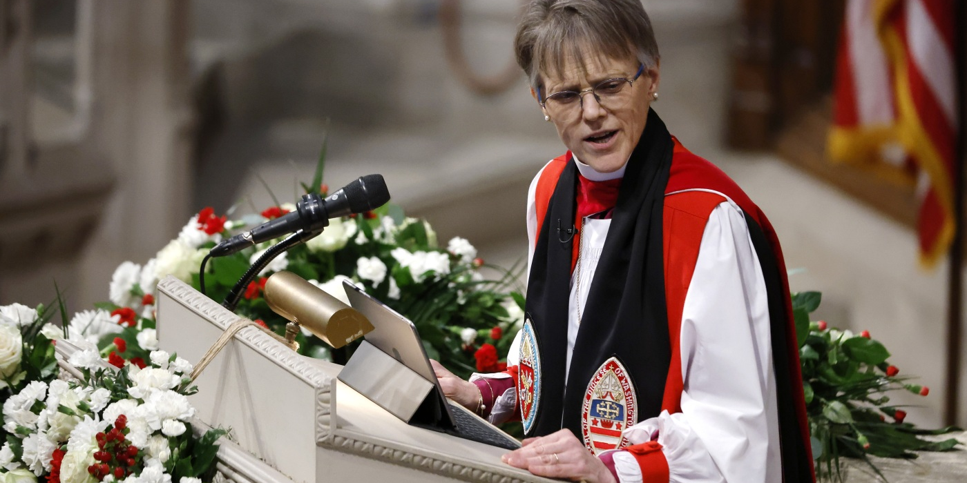 Bishop Mariann Edgar Budde delivering a sermon in which she directly confronted President Trump during the National Prayer Service at Washington National Cathedral in January. Chip Somodevilla/Getty Images hide...