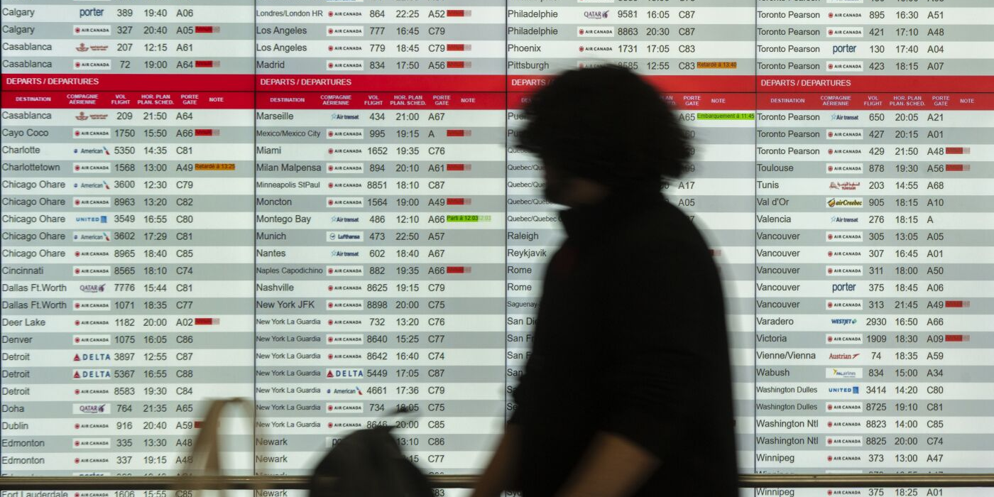 Cancelled and delayed Air Canada flights are seen on the departure board at Montreal-Pierre Elliott Trudeau International Airport on Friday. Christinne Muschi/The Canadian Press/AP hide caption toggle caption Christinne...