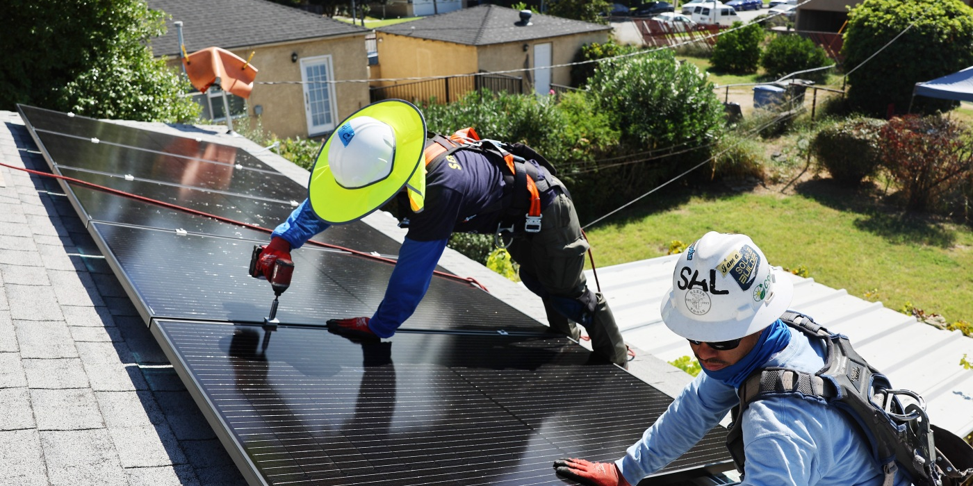 GRID Alternatives employees install no-cost solar panels on the rooftop of a low-income household on October 19, 2023 in Pomona, California. Mario Tama/Getty Images North America hide caption toggle...