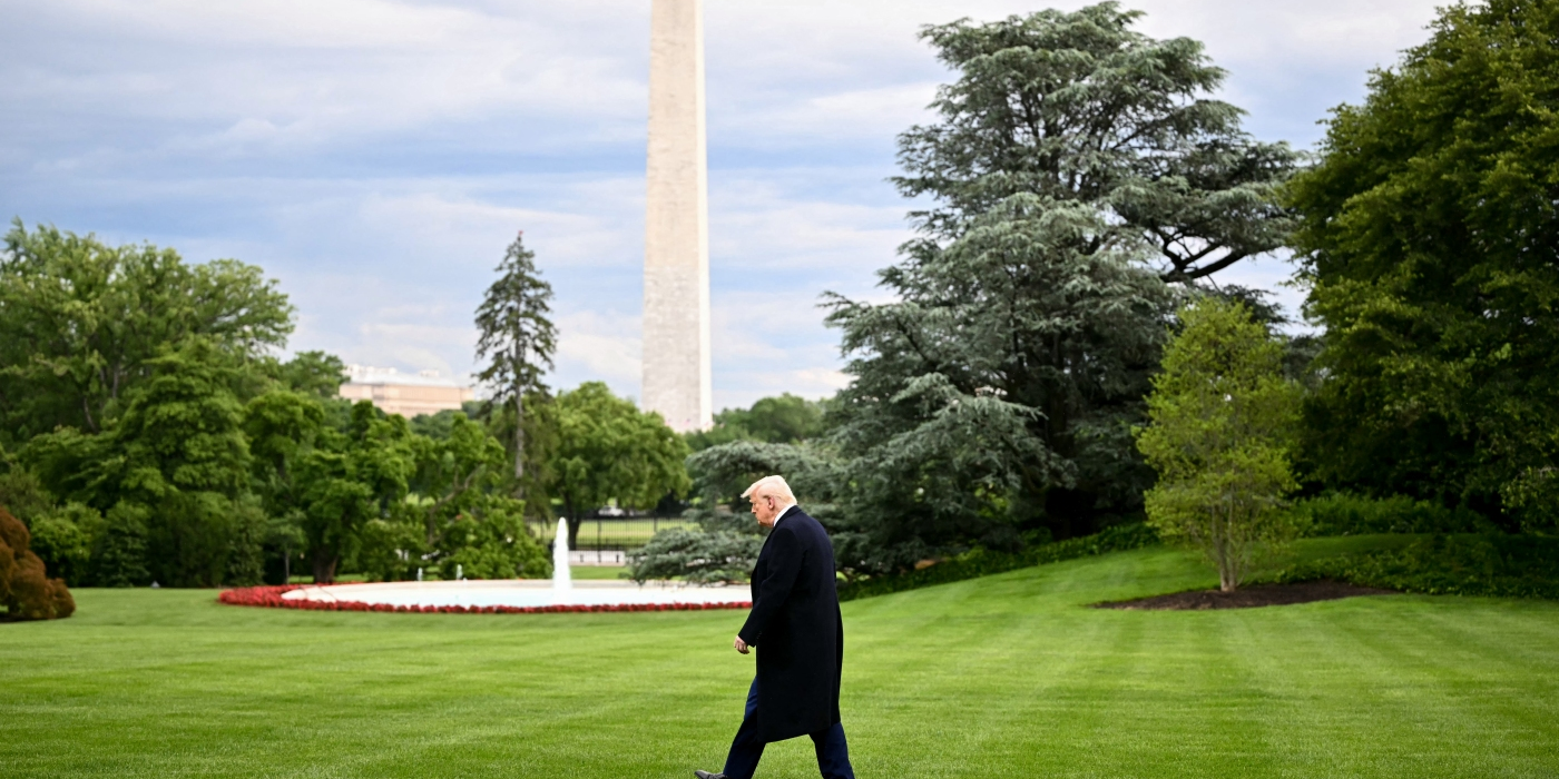 President Donald Trump is pictured walking to Marine One to depart the White House in May, with the Washington Monument in the background. Mandel Ngan/AFP via Getty Images hide...
