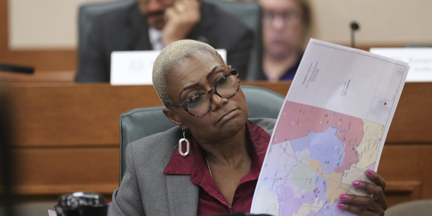 Texas state Rep. Jolanda "Jo" Jones, a Democrat, flips through maps during a public hearing on congressional redistricting in Austin, Texas, Friday, Aug. 1, 2025. After the bill passed...