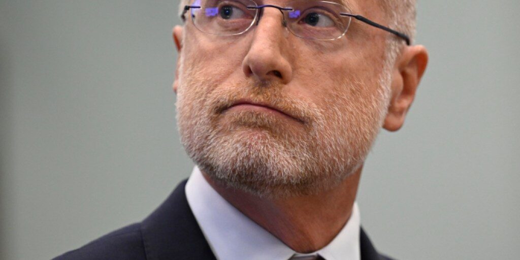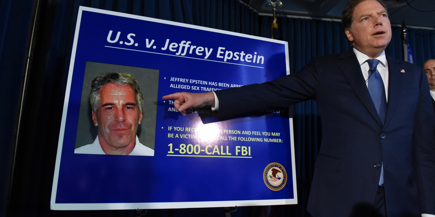 U.S. Attorney for the Southern District of New York Geoffrey Berman points to a photo of sex offender Jeffery Epstein on July 8, 2019, as he announces that Epstein...