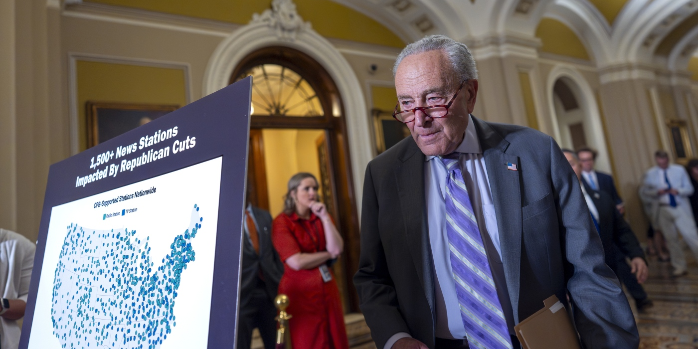 Senate Minority Leader Chuck Schumer, D-N.Y., arrives to speak with reporters about Senate Republicans' efforts to claw back $1.1 billion of funding authority from the Corporation for Public Broadcasting...