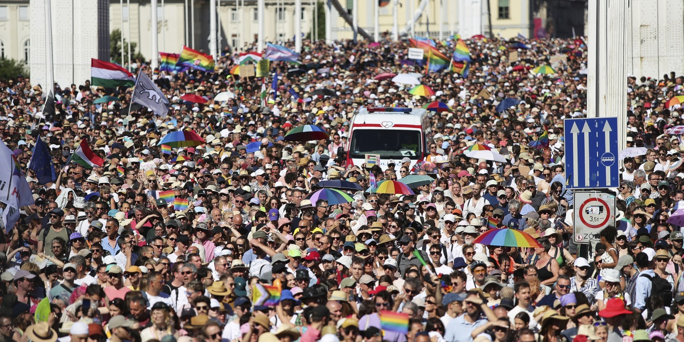 Participants in the Pride march cross the Elisabeth Bridge in Budapest, Hungary, on Saturday. Rudolf Karancsi/AP hide caption toggle caption Rudolf Karancsi/AP BUDAPEST, Hungary — Around 100,000 people defied...