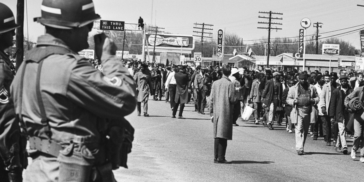 Soldiers watch civil rights protesters walking during the third Selma March in Alabama, on March 25, 1965. President Lyndon Johnson federalized the Alabama National Guard to prevent violence against...