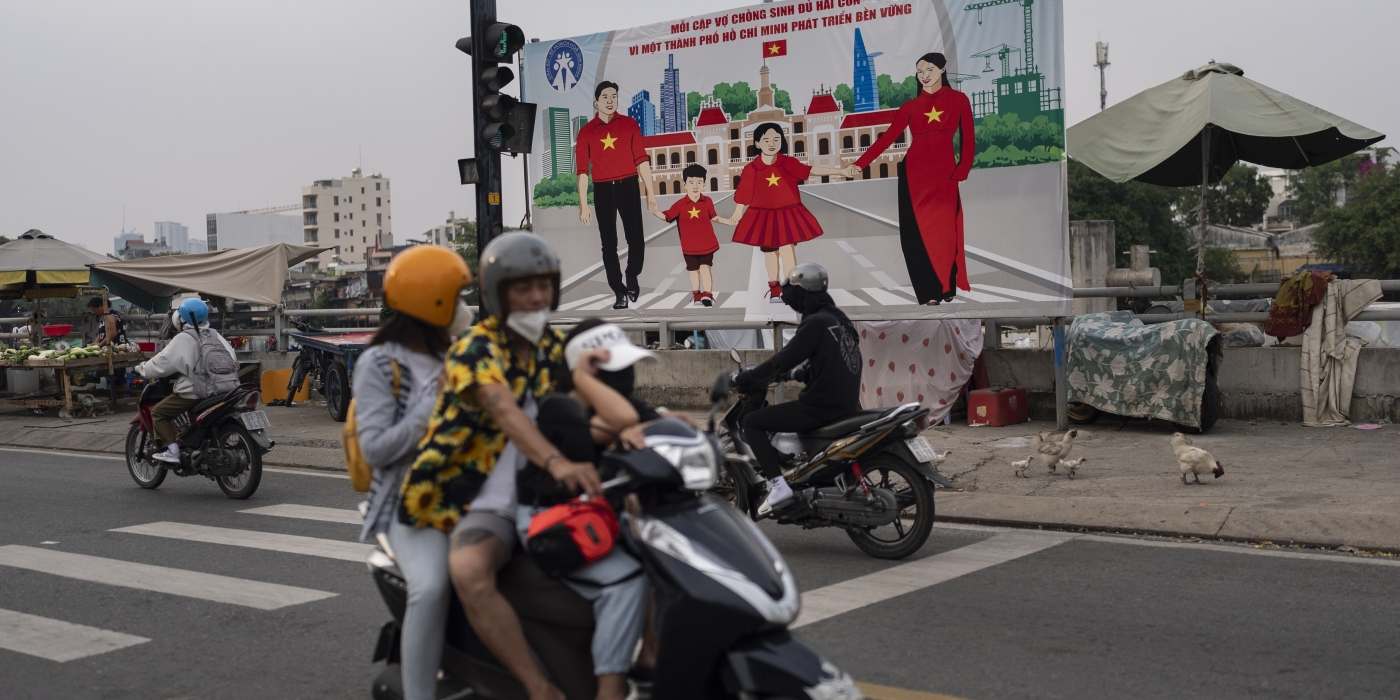 A billboard campaigning for each family to have two children hangs above a street in Ho Chi Minh City, Vietnam, Jan. 14, 2024. Jae C. Hong/AP hide caption toggle...