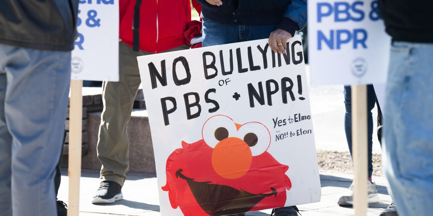 People participate in a rally to call on Congress to protect funding for public broadcasters PBS and NPR outside the NPR headquarters in Washington, DC, on March 26, 2025....
