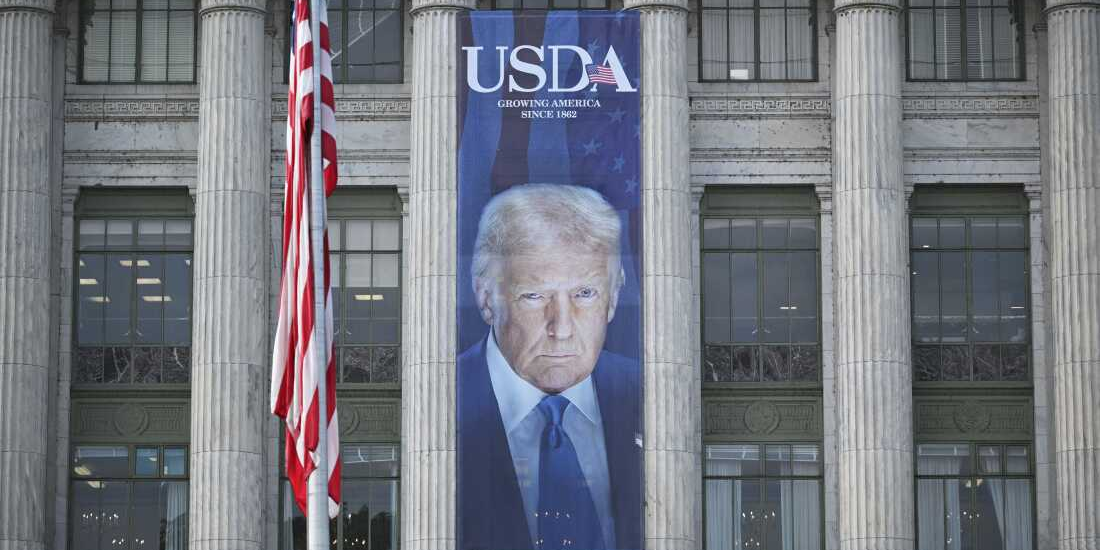 A banner showing an image of US President Donald Trump hangs on the side of a US Department of Agriculture building in Washington, DC, on May 16, 2025. USDA...