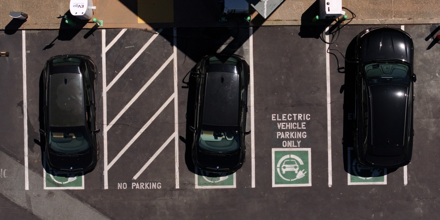 In an aerial view, electric cars sit parked at a charging station in Corte Madera, Calif., on May 15. Federal tax credits that have encouraged the purchase of electric...