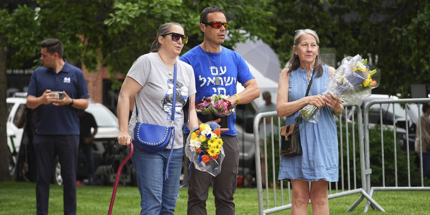 From left, Carrie Spyva-McIlvaine, Gabriel Velasco and Lisa Turnquist arrive to place bouquets of flowers at a memorial after Sunday's attack in Boulder, Colorado. David Zalubowski/AP hide caption toggle...