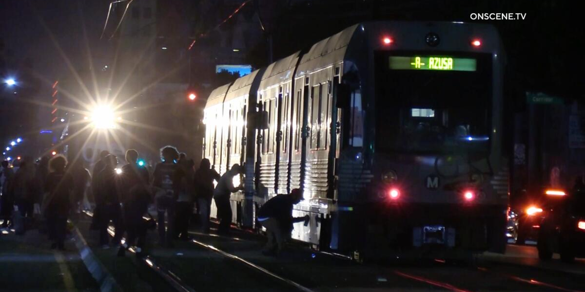 The crowd gathered at midnight at Washington Boulevard and Maple Avenue. It’s unclear why dozens of people converged at the intersection just south of downtown Los Angeles, but some...