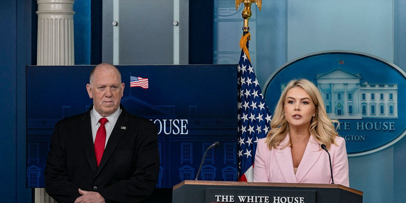 Press Secretary Karoline Leavitt (right) speaks as border czar Tom Homan looks on during a White House briefing on Monday. Andrew Thomas/AFP via Getty hide caption toggle caption Andrew...