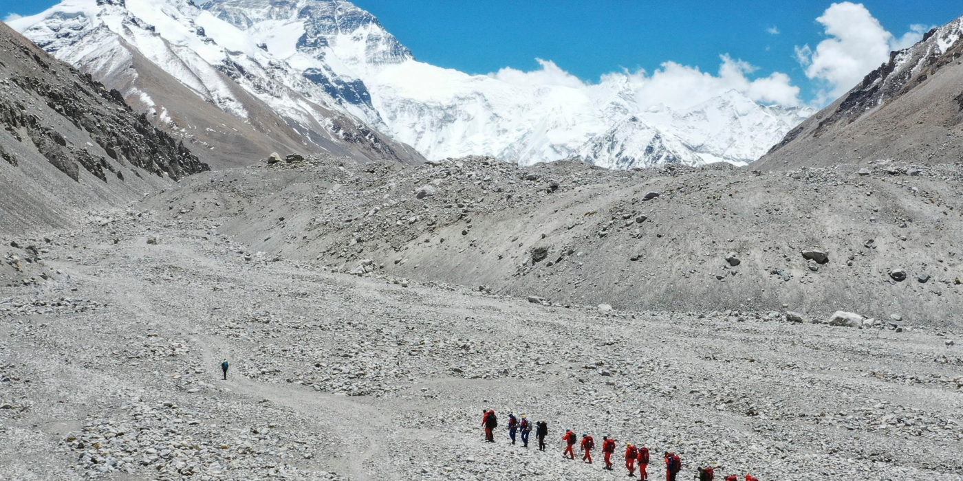 FILE - In this May 16, 2020 aerial photo released by Xinhua News Agency, Chinese surveyors hike toward a higher spot from the base camp on Mount Qomolangma at...
